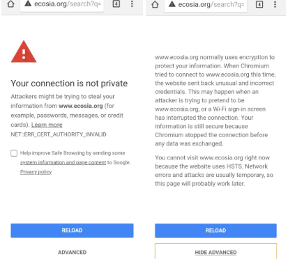 Luckily enough, many web pages reconnect their users to a more secure form of their websites using something called “HTTPS”. This can be easily spotted if an individual looks at the far left of their URL bar to spot a lock next to the website address (URL) that the individual is visiting. If the device is accidentally connected to a WiFi Pineapple, most likely the user will see the following error message in Images 5 & 6.