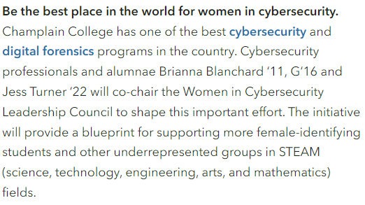 According to US News, Champlain College’s student body is 64% male and 36% female, and that disparity grows when examining the gender breakdown in the Division of Information Technology and Sciences. However, the college has been attempting to close that gap over the past few years. Hernandez’s new mission statement is one part of that goal. Champlain College provides amazing support for its female student body, including a Womxn in Technology Club, a chapter of the Women in Cybersecurity (WiCyS) national organization, and a Women’s and Gender Center on campus.