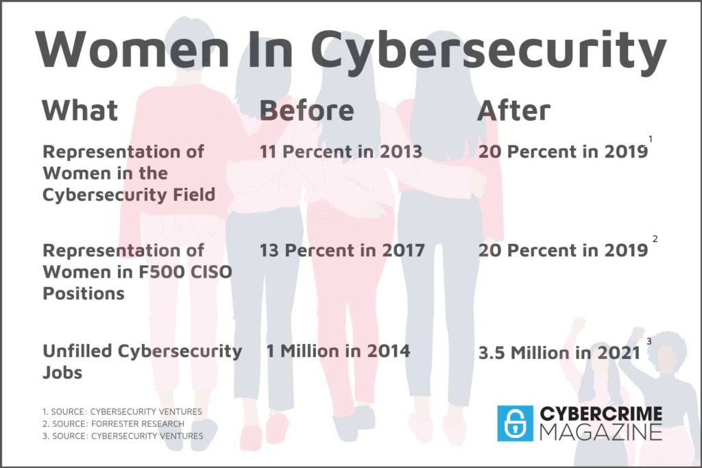 - Sausalito, Calif. “Women Represent 20 Percent of the Global Cybersecurity Workforce in 2019.” Cybercrime Magazine, 28 Mar. 2019, https://cybersecurityventures.com/women-in-cybersecurity-20-percent-2019/.