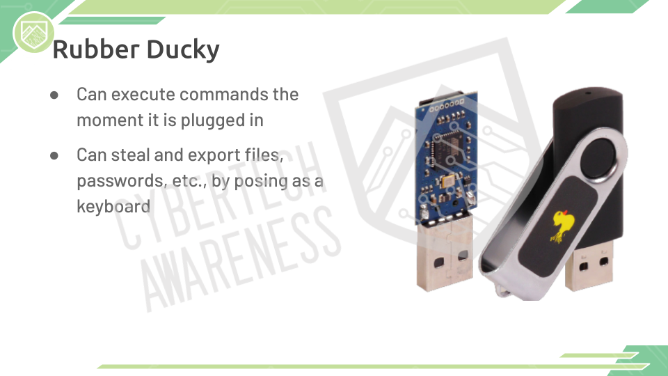 In the field of cyber security, a rubber ducky is not the sort of yellow squeaky bathtime companion that we may have grown up with as kids. A rubber ducky is a type of peripheral–hardware that connects to a computer–that can be disguised as anything. A common physical form for a rubber ducky is a simple flash drive that plugs into the USB port of your computer. It may look harmless, but hidden inside is the same sort of software that sits inside your keyboard–in fact, your device will interpret it as its own keyboard. From there, the rubber ducky can type anything the same way you would with a keyboard–it can open command prompts and type in its own pre-determined scripts or even download malware from the internet.