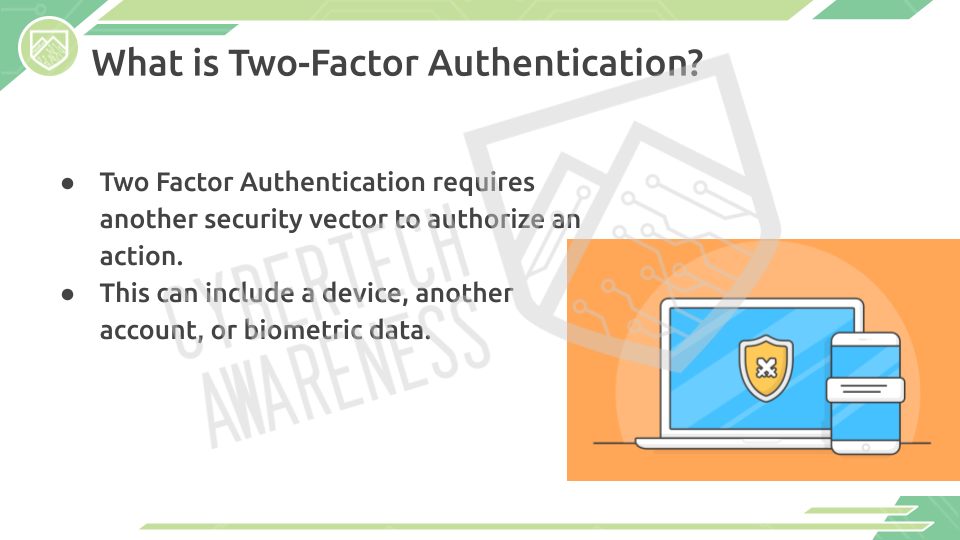 Two-factor authentication is a security process where the credentials for an account, process, or verification require a second form of authentication to be accepted. Two Two-factor authentication can include a security token, biometric scans, or a device such as a Yubikey. This added security measure is more secure than just a normal password since it requires access to another form of data in addition to a password.