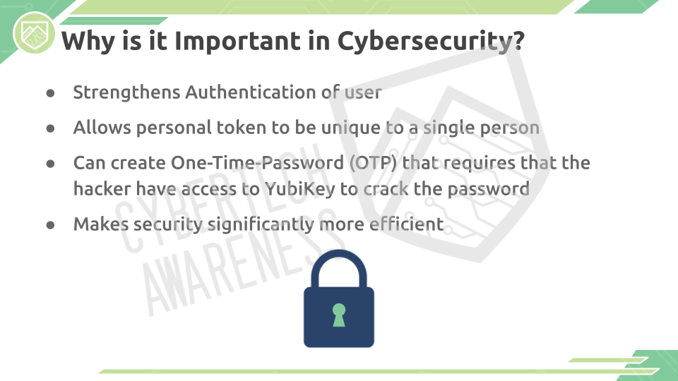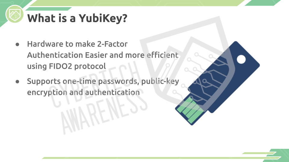 YubiKey is a device that can be used for two-factor and multi-factor authentication, one-time passwords, and public-key encryption and authentication. It uses the FIDO2 protocol to make authentication easier and more efficient. The device utilizes USB-A and NFC interfaces in conjunction with finger sensors, making security more efficient and able to be unique to an individual. YubiKey can also create One-Time-Passwords (OTP) that require access to the YubiKey to crack.