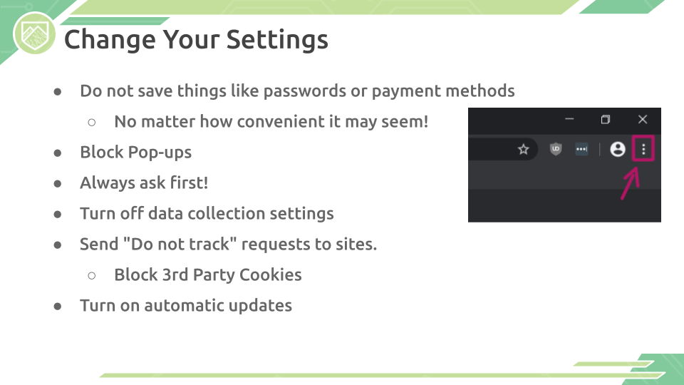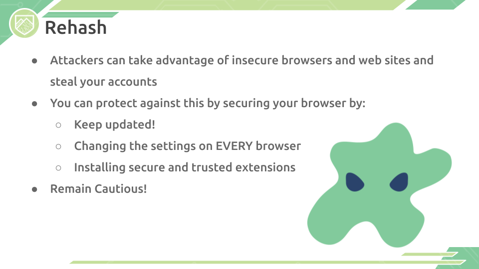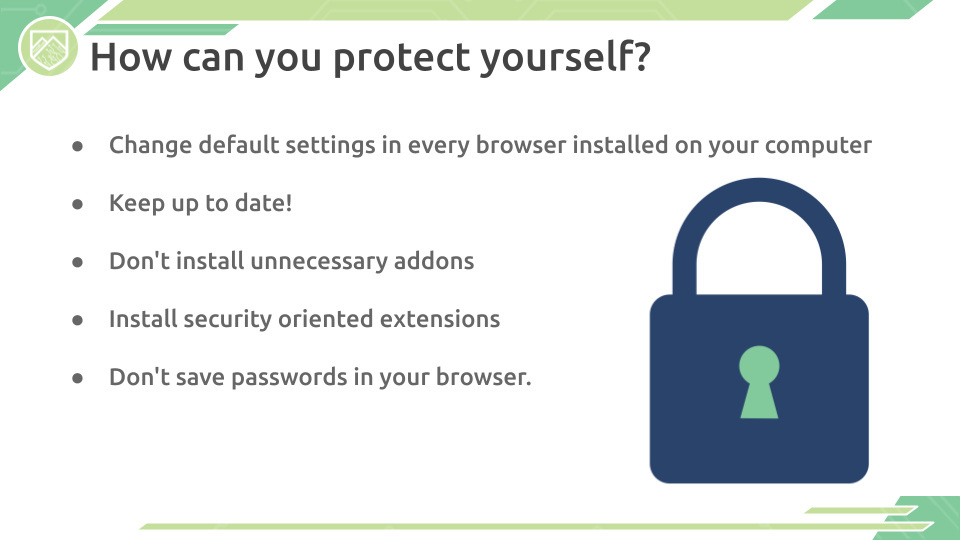 The most commonly used application that nearly every computer user utilizes is the Browser. Browsers such as Google Chrome, Internet Explorer, Mozilla Firefox, and Safari can be some of the most useful tools to any user when used right, so it is always important to keep your browsers secured to keep yourself and your information safe. Learn about some of the techniques and settings you can configure at home, in addition to some of the dangers on the web.