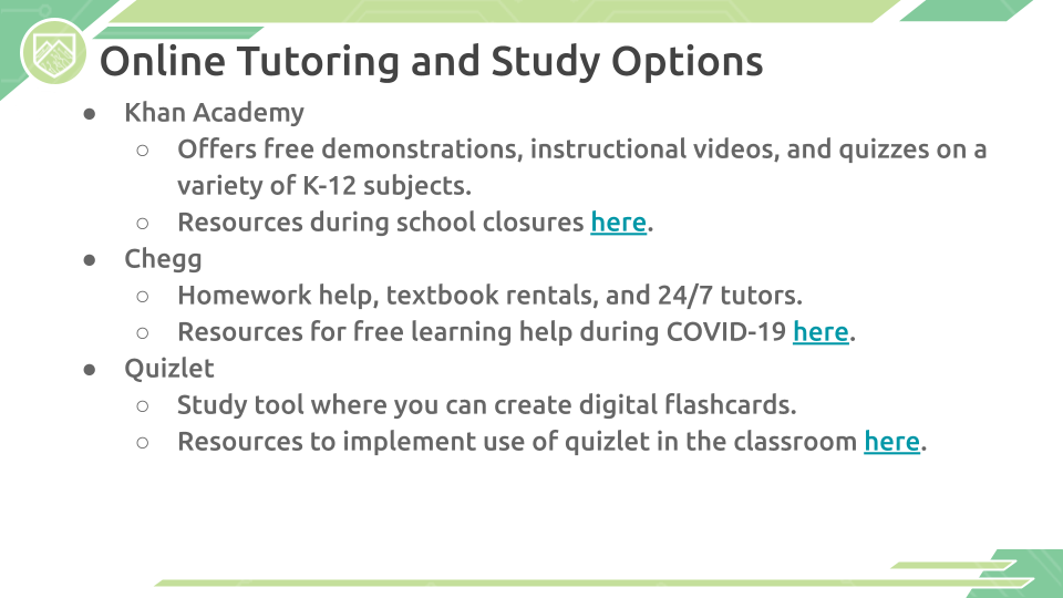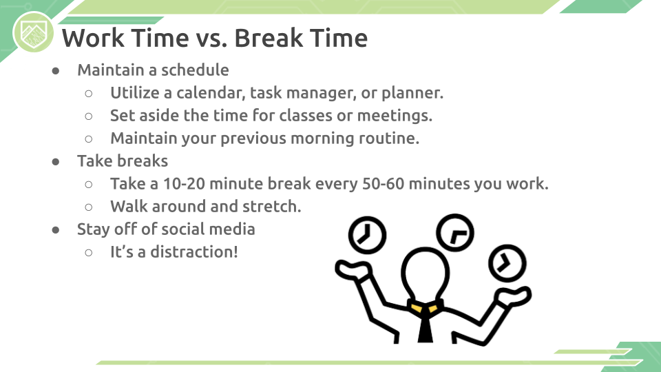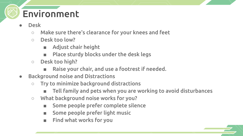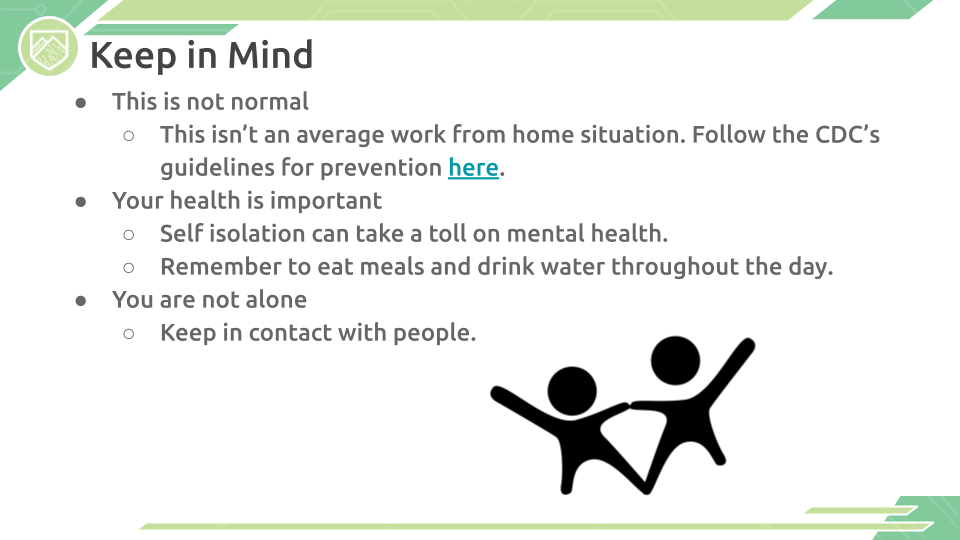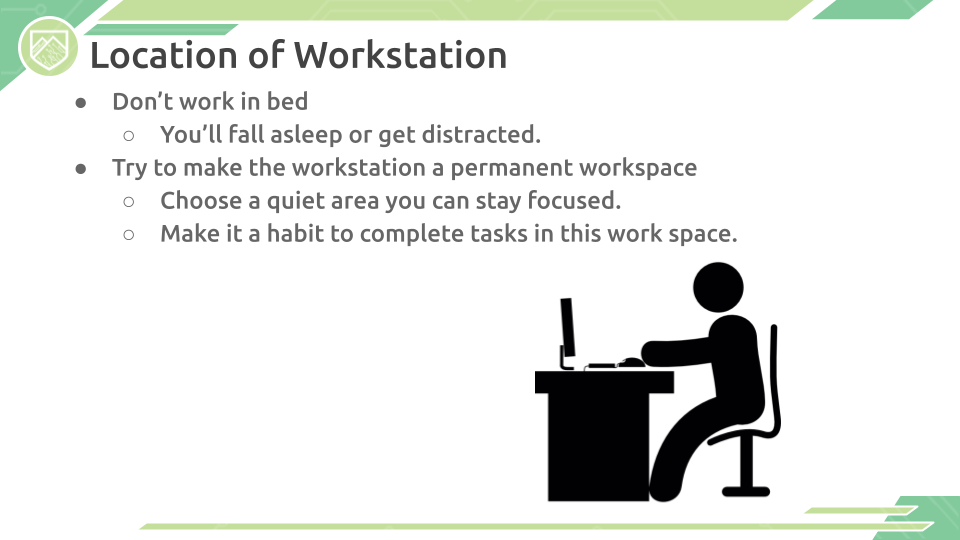 Note 11/15/23: The materials below were created in 2020-2021 to aid students, parents, and educators with navigating working from home. While some of the text may be outdated, our Google Slides contain valuable information for those continuing to work from home (both in the workforce and for school).