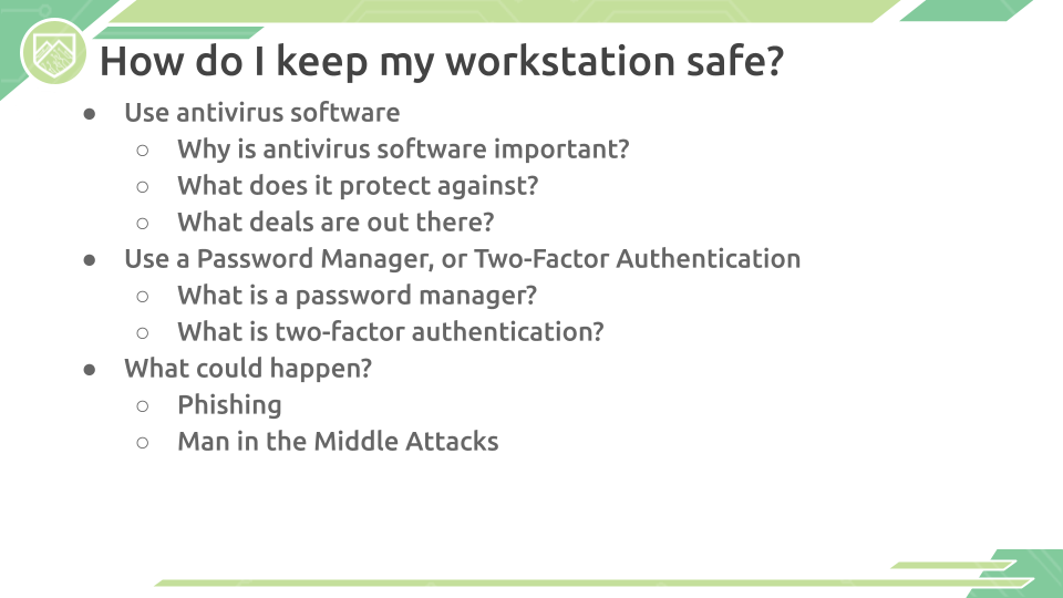 We still need to work towards securing our workstation to accommodate the transition to online learning and working. This presentation provides some suggestions for securing your work area with tips including: using Antivirus, keeping your passwords and accounts safe, and being aware of cyber threats online.