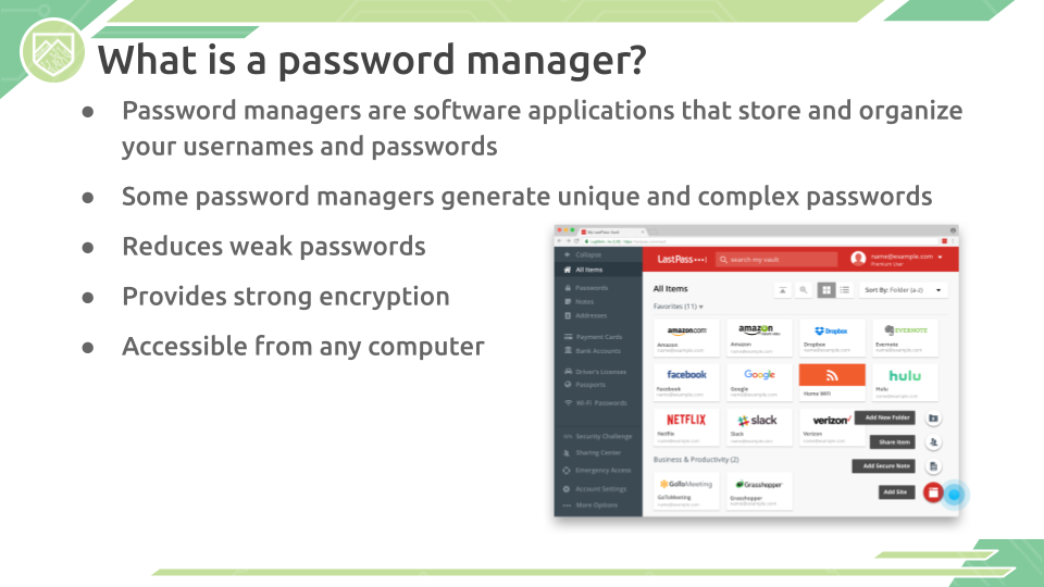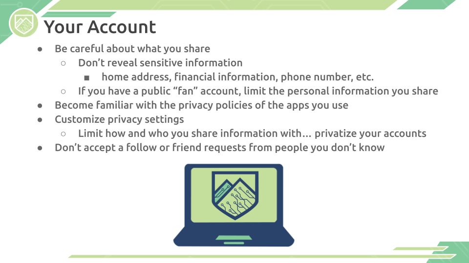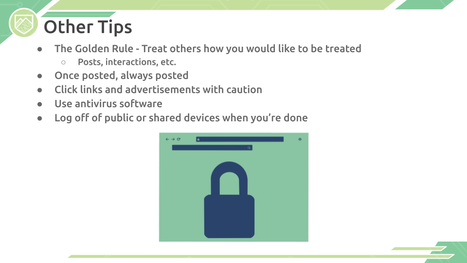 As most work, school, and social interactions are now moved online, it is important to remember that your personal security still matters! Stay Safe Online presentation gives suggestions for how to keep yourself safe on social media, protect your privacy, and keep your computer life secured.